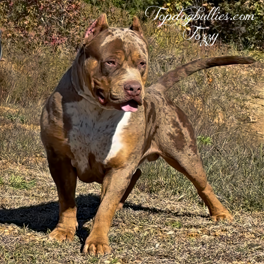 Topdog Bullies Fozzy is a chocolate tri merle XL American Bully stud or an XL Pitbull stud
